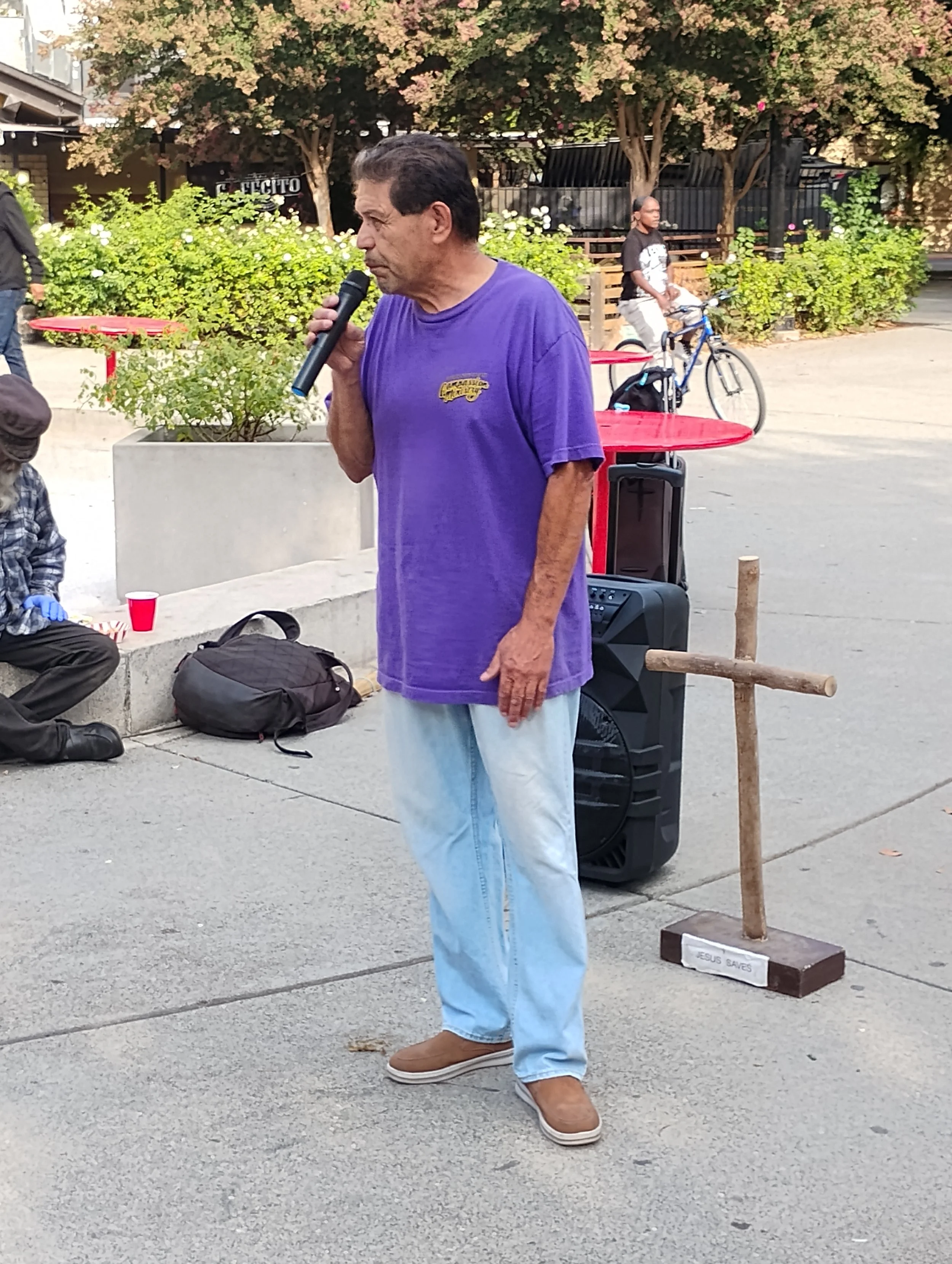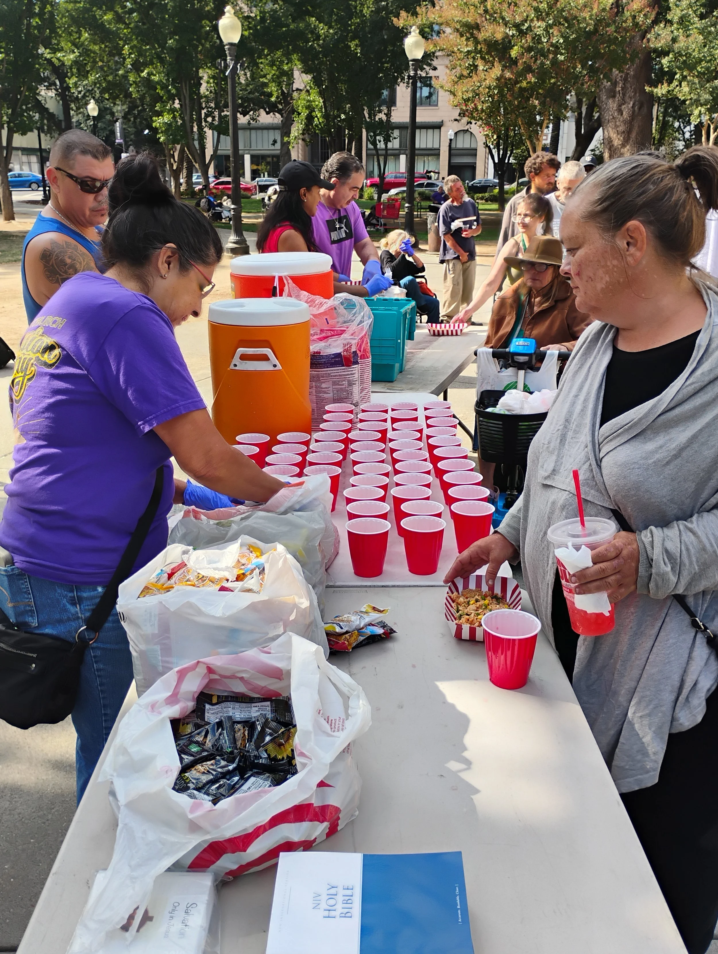 About once a month, Christ’s Compassion Church serves a hot meal, water, hygiene products, clothes, Bibles and even prayers to the homeless and needy at Cesar Chavez Park in Downtown Sacramento. Pastor Jaime Torres and other pastors preach the love of God and the way to be saved through Jesus in a sermon as well. You can help this important ministry, too, by donating these needed things to the outreach, or even volunteering your time. Please contact us for more information.